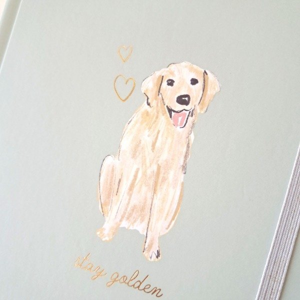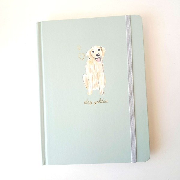 Tiene cierre con elástico y efecto foil dorado en la tapa.