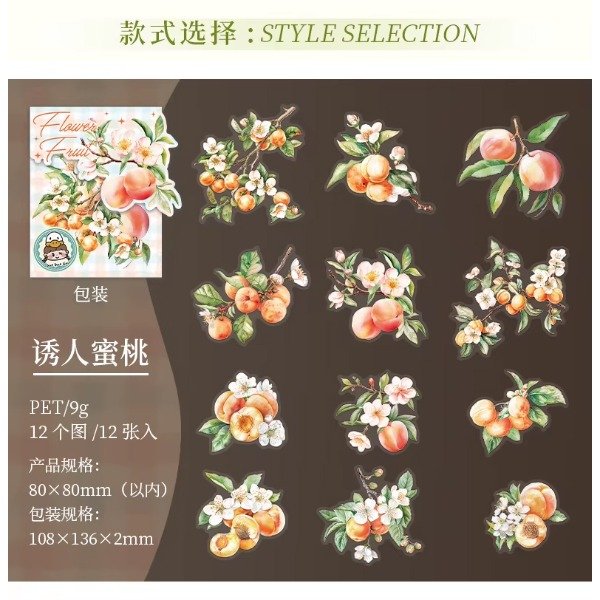 Set de 12 stickers transparentes - Flower Fruit: Duraznos