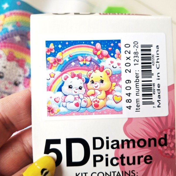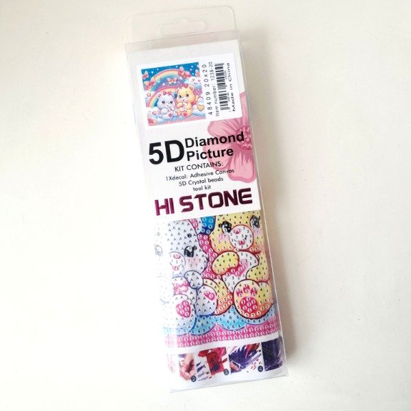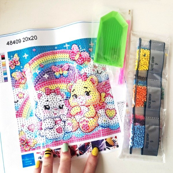 Kit de diamond painting que incluye el canvas, diamantes de diferentes colores, la herramienta para aplicarlos, el pegamento y una base de plástico para ordenar los diamantes antes de aplicarlos.