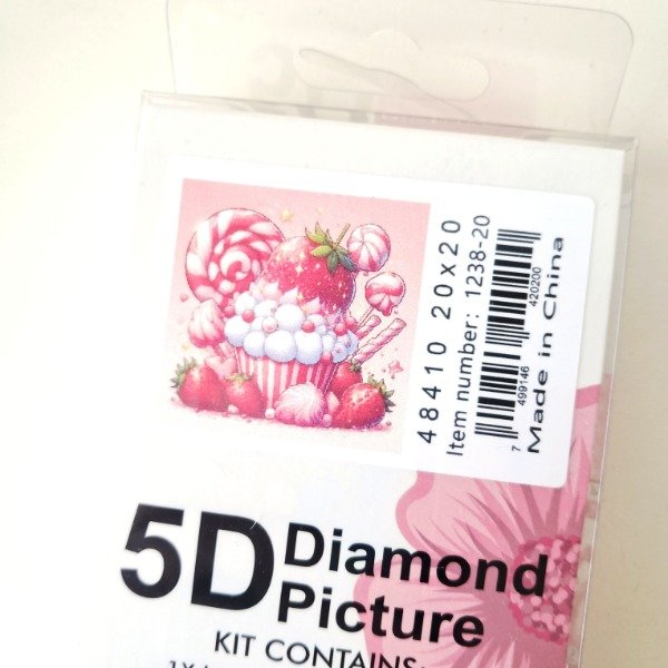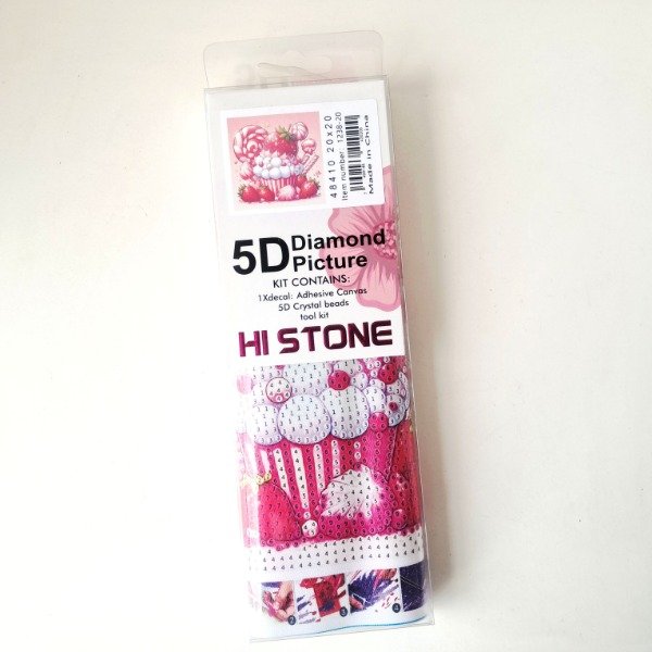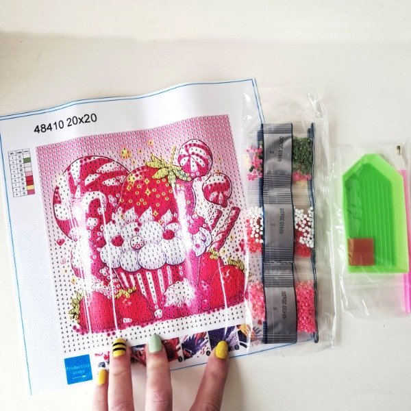 Kit de diamond painting que incluye el canvas, diamantes de diferentes colores, la herramienta para aplicarlos, el pegamento y una base de plástico para ordenar los diamantes antes de aplicarlos.