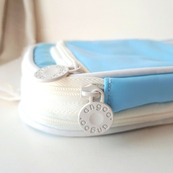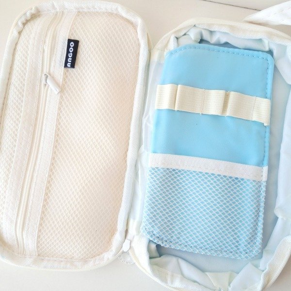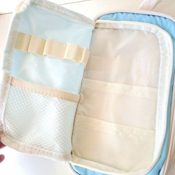Cartuchera de tela resistente. Tiene un compartimento con cierre y dentro tiene un bolsillo y lugar para separar 5 lápices, y un bolsillo externo con elástico para 5 lápices más. Se puede agrandar.