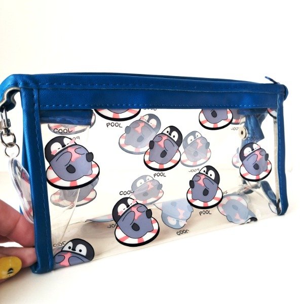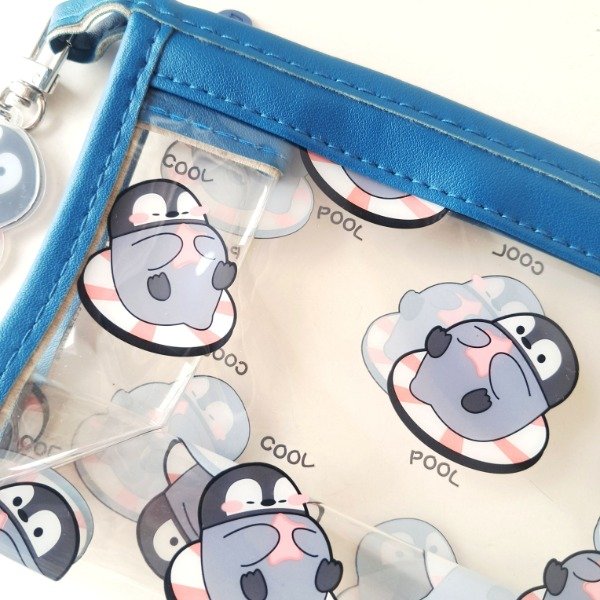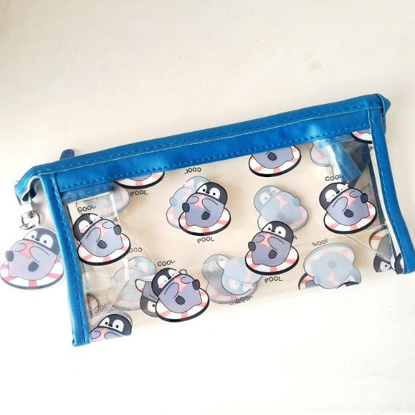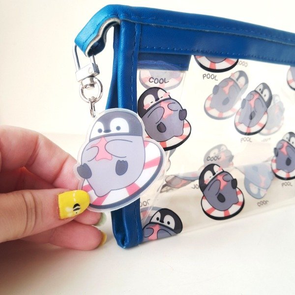 Cartuchera de plástico transparente con un llavero de acrílico.