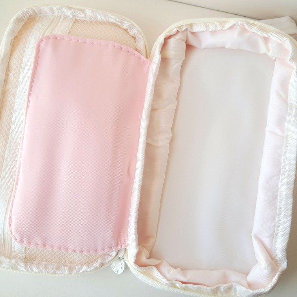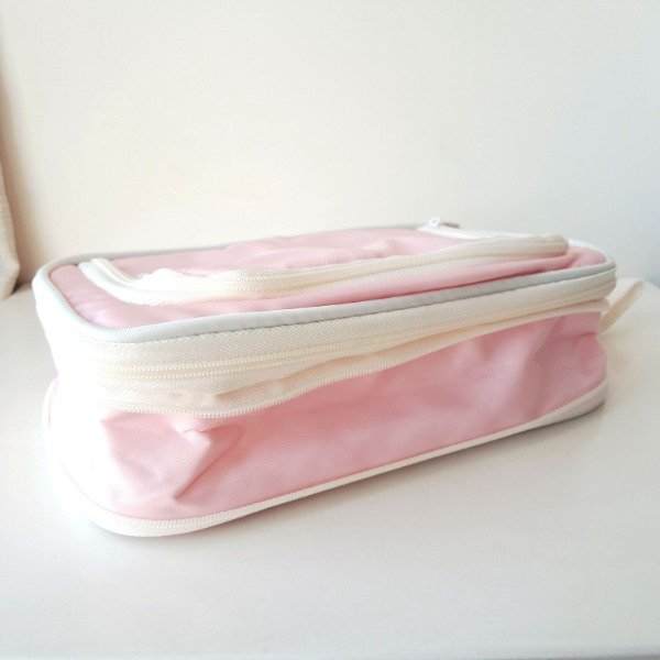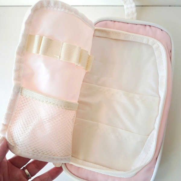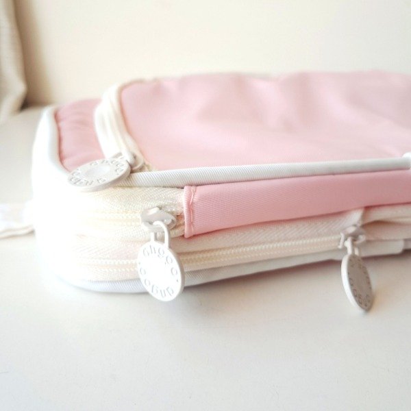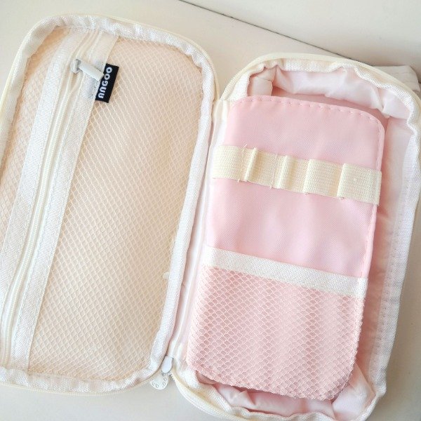 Cartuchera de tela resistente. Tiene un compartimento con cierre y dentro tiene un bolsillo y lugar para separar 5 lápices, y un bolsillo externo con elástico para 5 lápices más. Se puede agrandar.