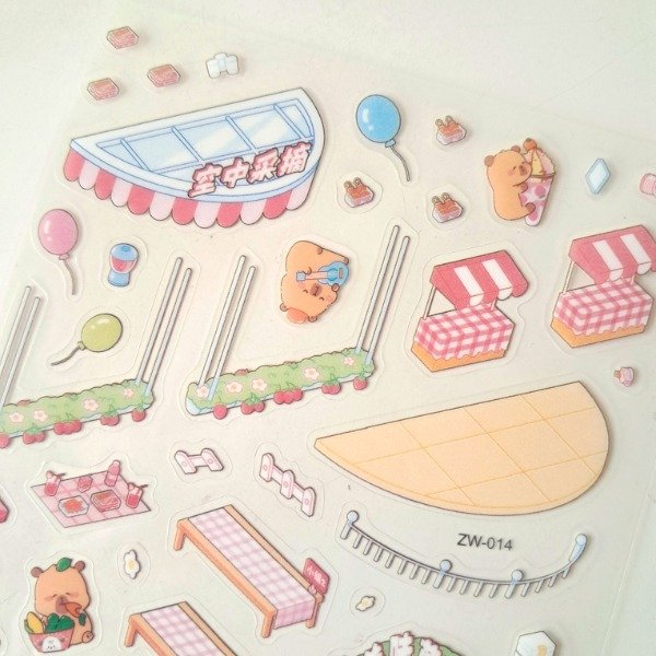 Viene con 1 plancha de stickers PET transparentes y una base de papel para aplicar los stickers y decorar el espacio como vos quieras.