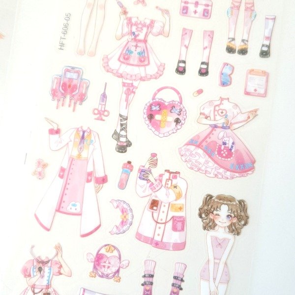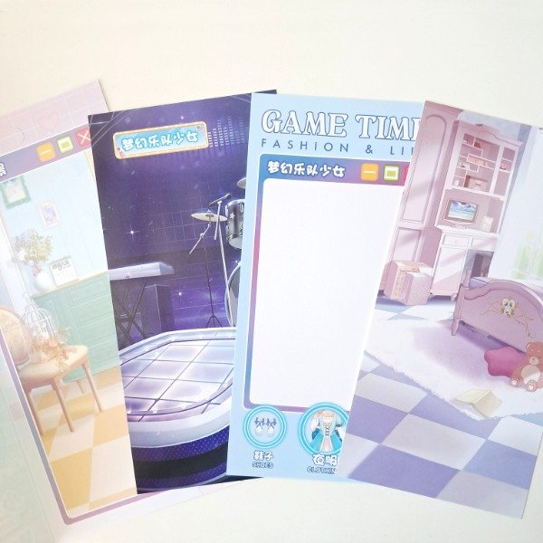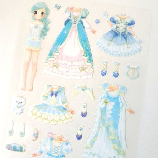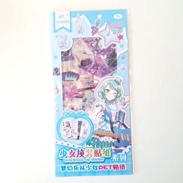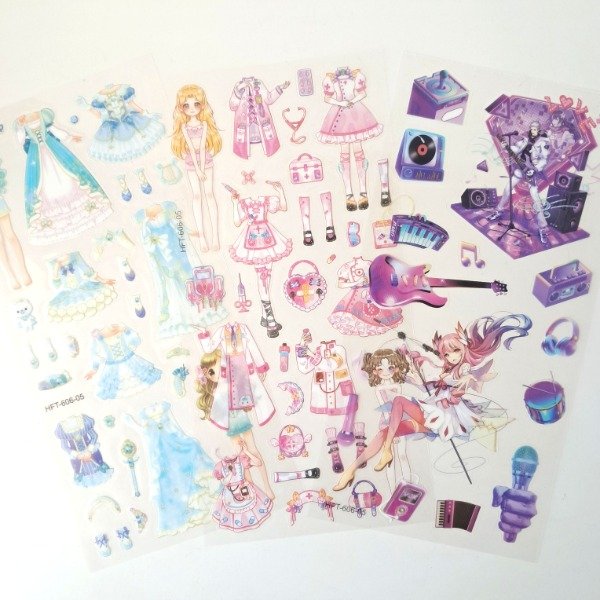 Incluye 3 planchas de cartulina con escenarios y 3 planchas de stickers con ropita y personajes para vestir.