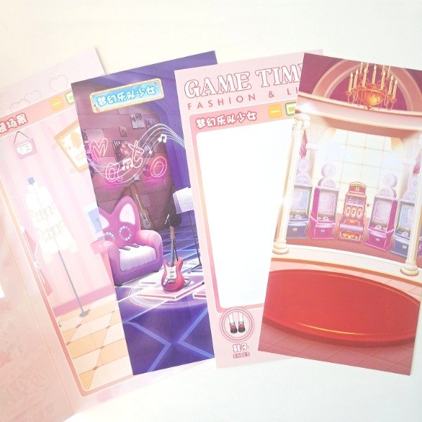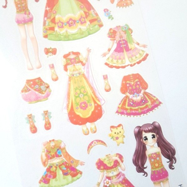 Incluye 3 planchas de cartulina con escenarios y 3 planchas de stickers con ropita y personajes para vestir.