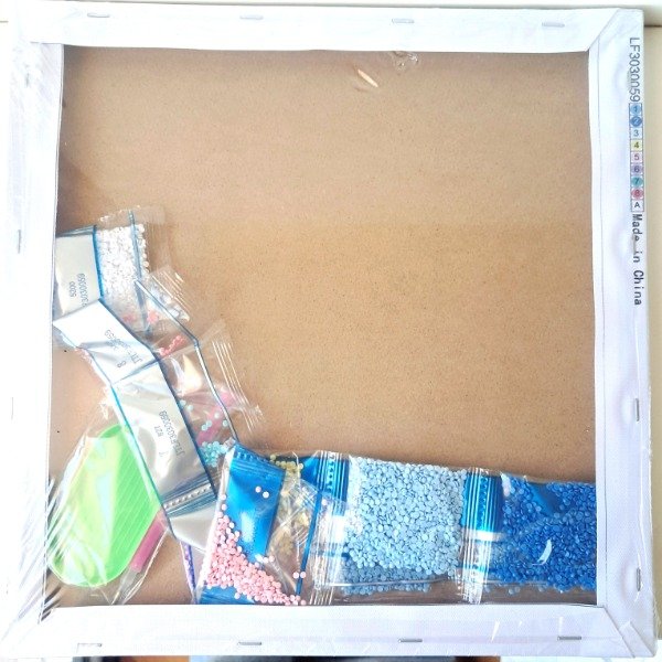 Kit de diamond painting que incluye un lienzo montado en un marco (listo para colgar), diamantes de diferentes colores, la herramienta para aplicarlos, el pegamento, una base de plástico para ordenar los diamantes antes de aplicarlos.